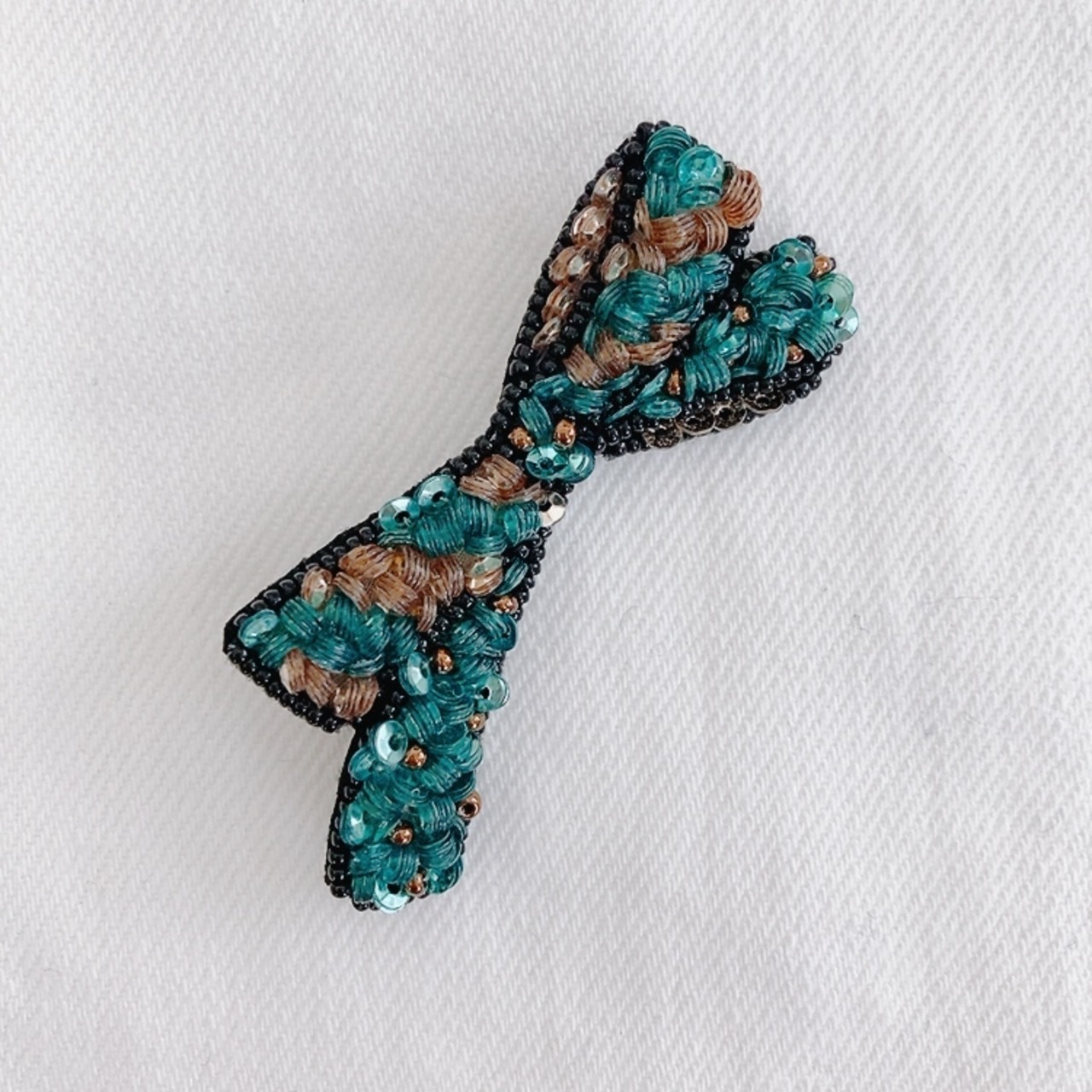 いくつになってもみんな大好きなリボンモチーフのブローチキットです。スパンコールを立てて刺繍することで、ビーズとはまた違う「もこもこ」としたかわいいニュアンスに。縦横お好みで付けられるデザインは、あまくなり過ぎず老若男女問わずお使頂けますので、プレゼントにもオススメです。
