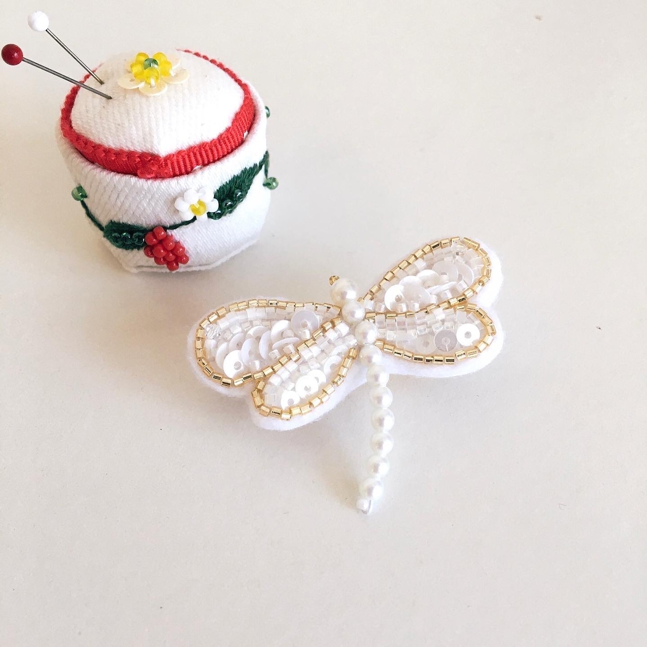 【キット】パールホワイト×ビーズ トンボのビーズ刺繍ブローチ