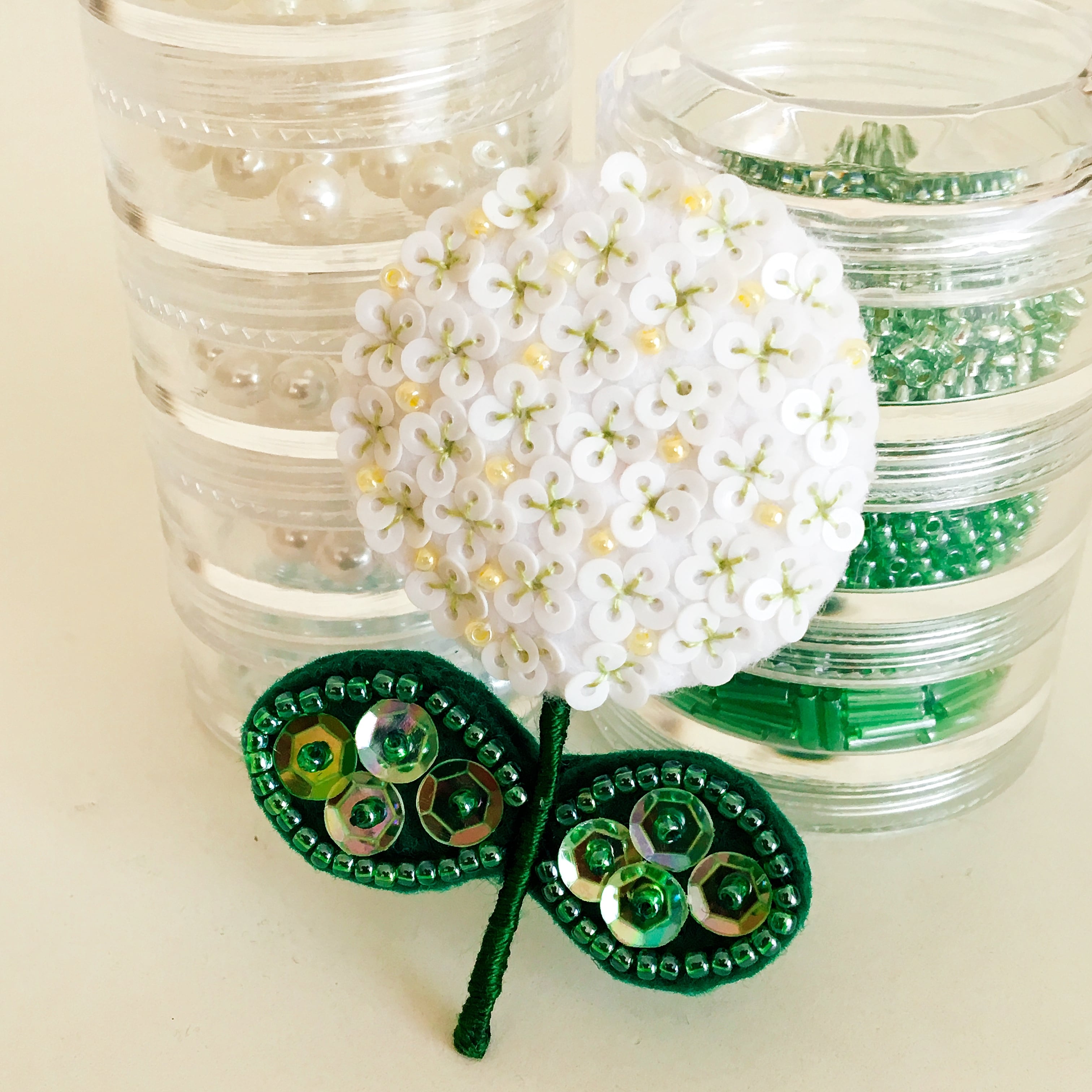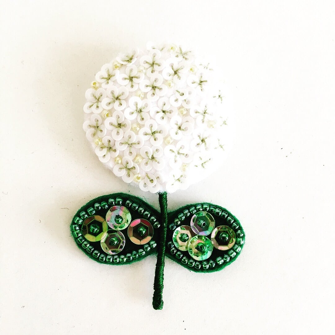 小さなスパンコール のお花とぷっくりとした形が優しい雰囲気の紫陽花ブローチのキットです。