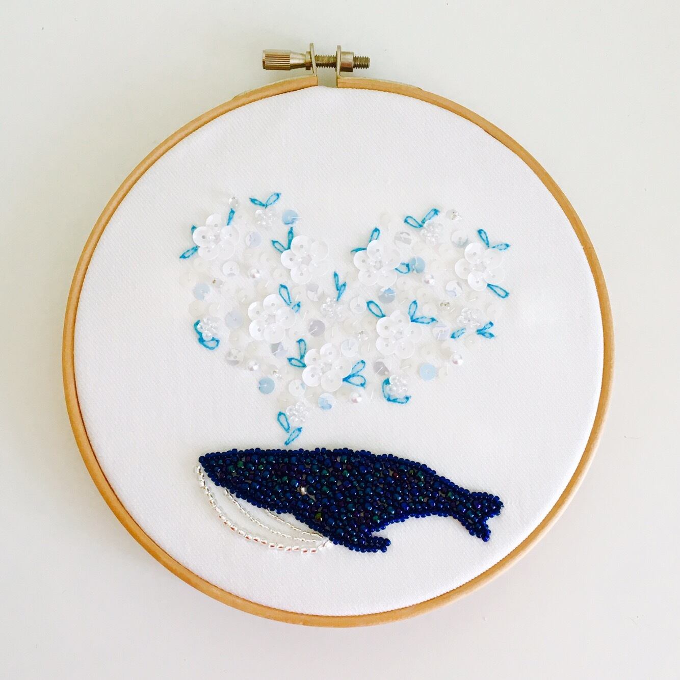 夏にぴったりのクジラのフープアートです。15cm刺繍枠にピッタリサイズで、ちょっとしたところへ飾るのにちょうどよいサイズ感です。
