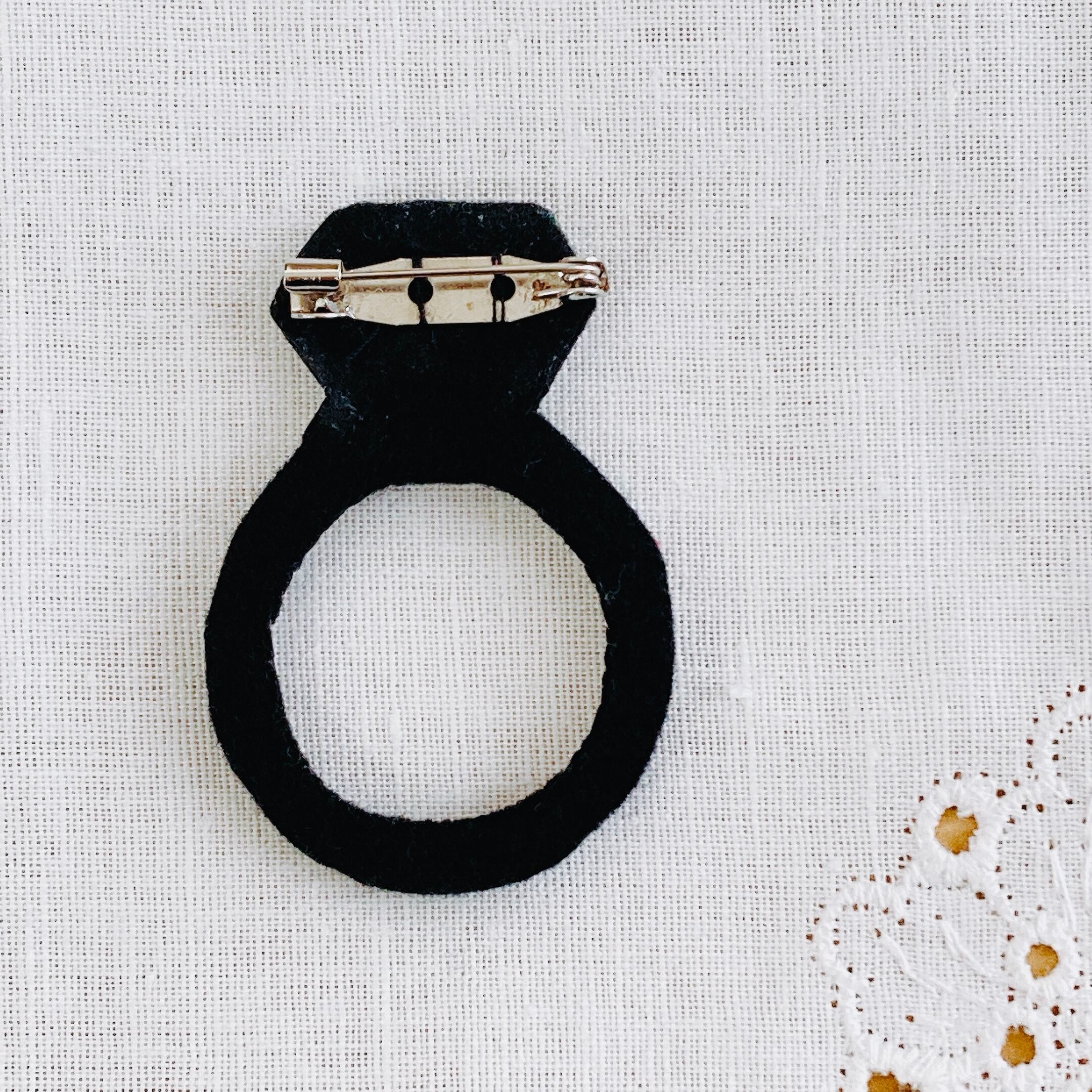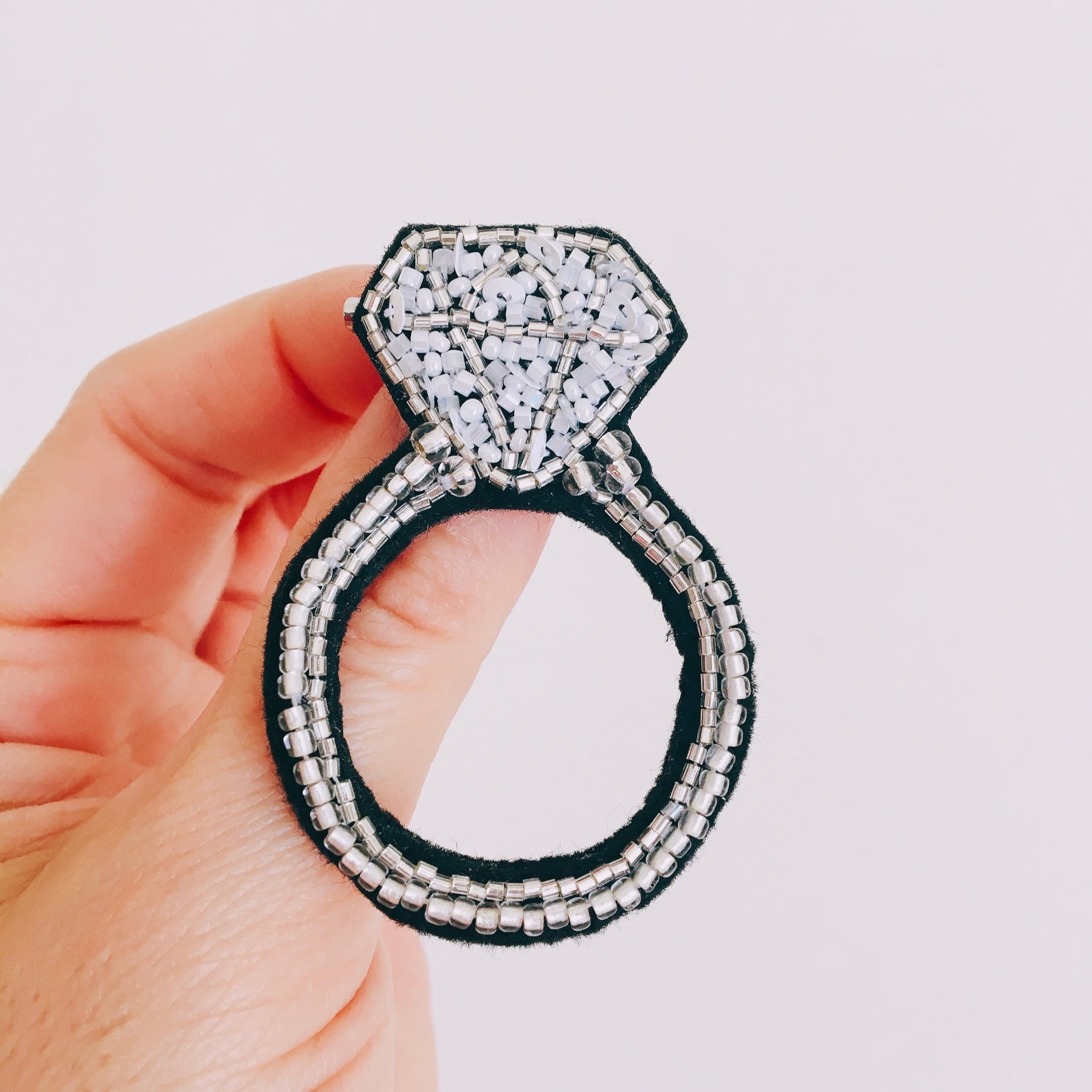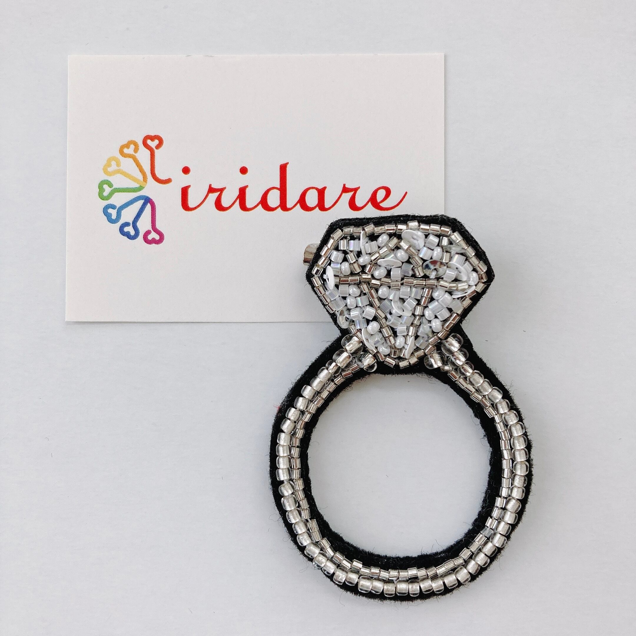 ダイヤの指輪を形どった可愛いブローチ。シルバー×ホワイトのビーズがポップなデザインながら繊細に光ります。