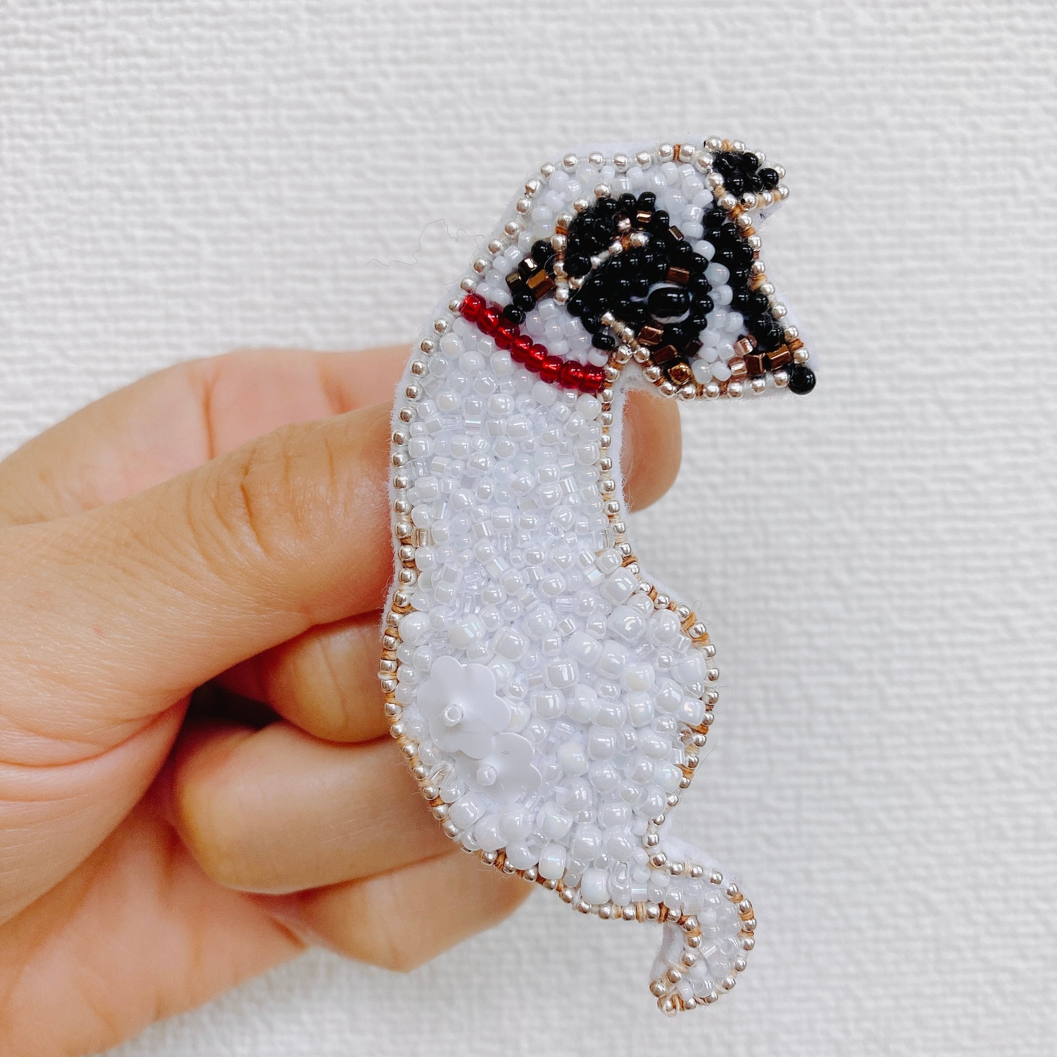 反省中のちょっとしょげたポーズがなんともキュートな日本テリアのブローチです。